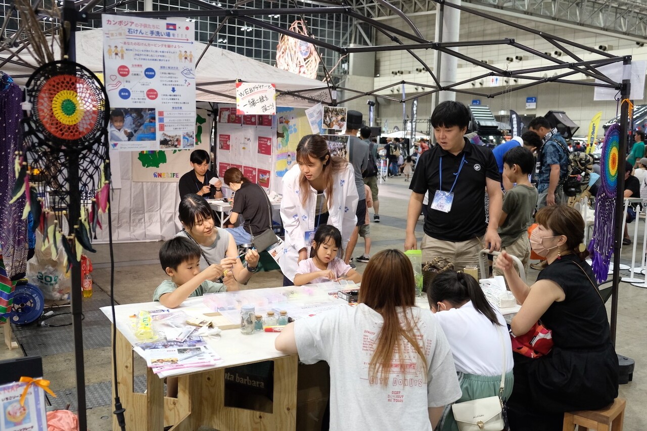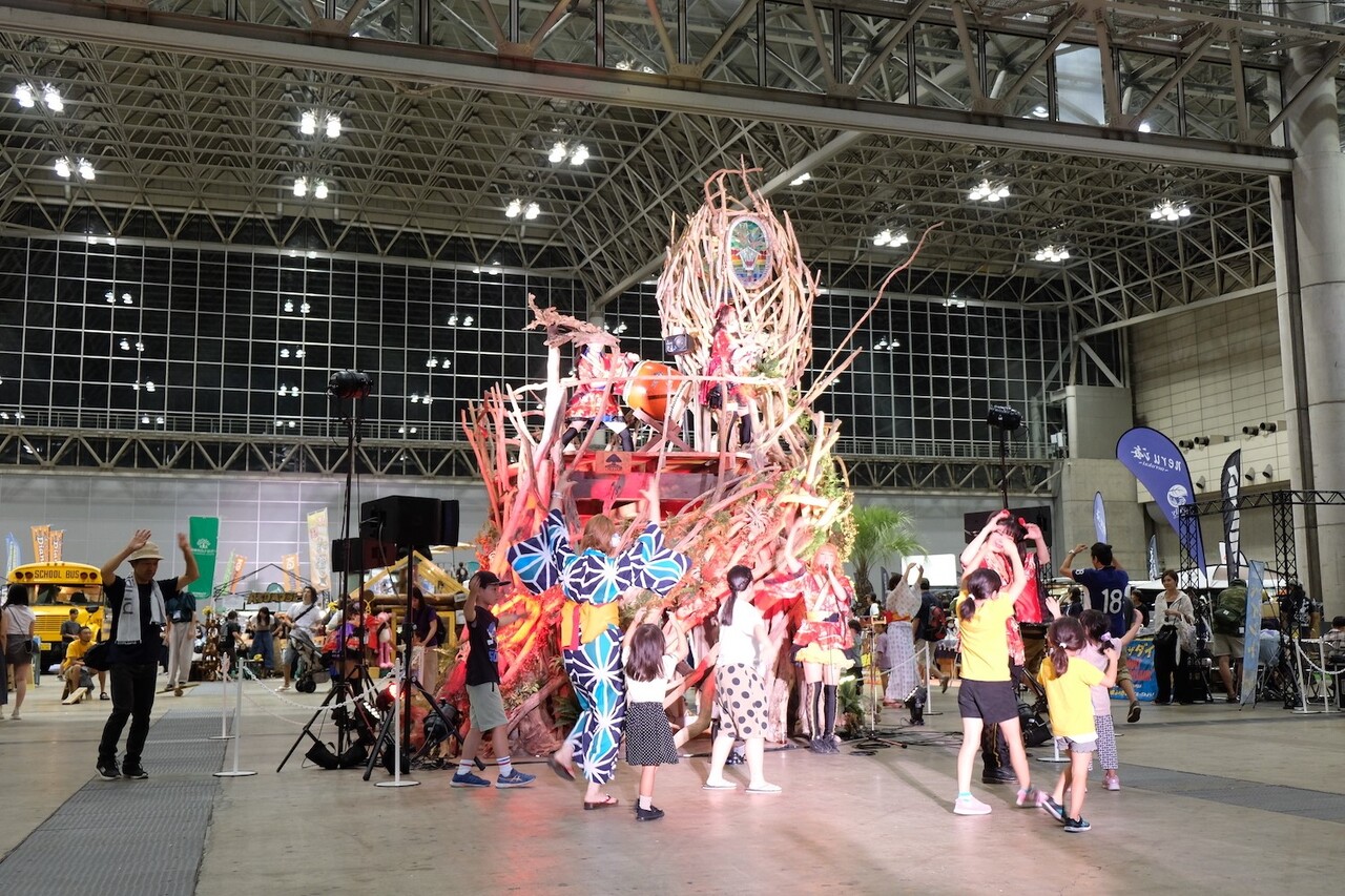 家族やカップルでの来場者が多かったのも特徴的でした。会場の中央には、ドーンとツリーハウスが建てられ、ツリーハウスを櫓と見たて、盆踊りやパフォーマンス、ライブなどが行われていました。盆踊りには小さなお子さんも参加して、夏気分をここでもエンジョイしていました。
