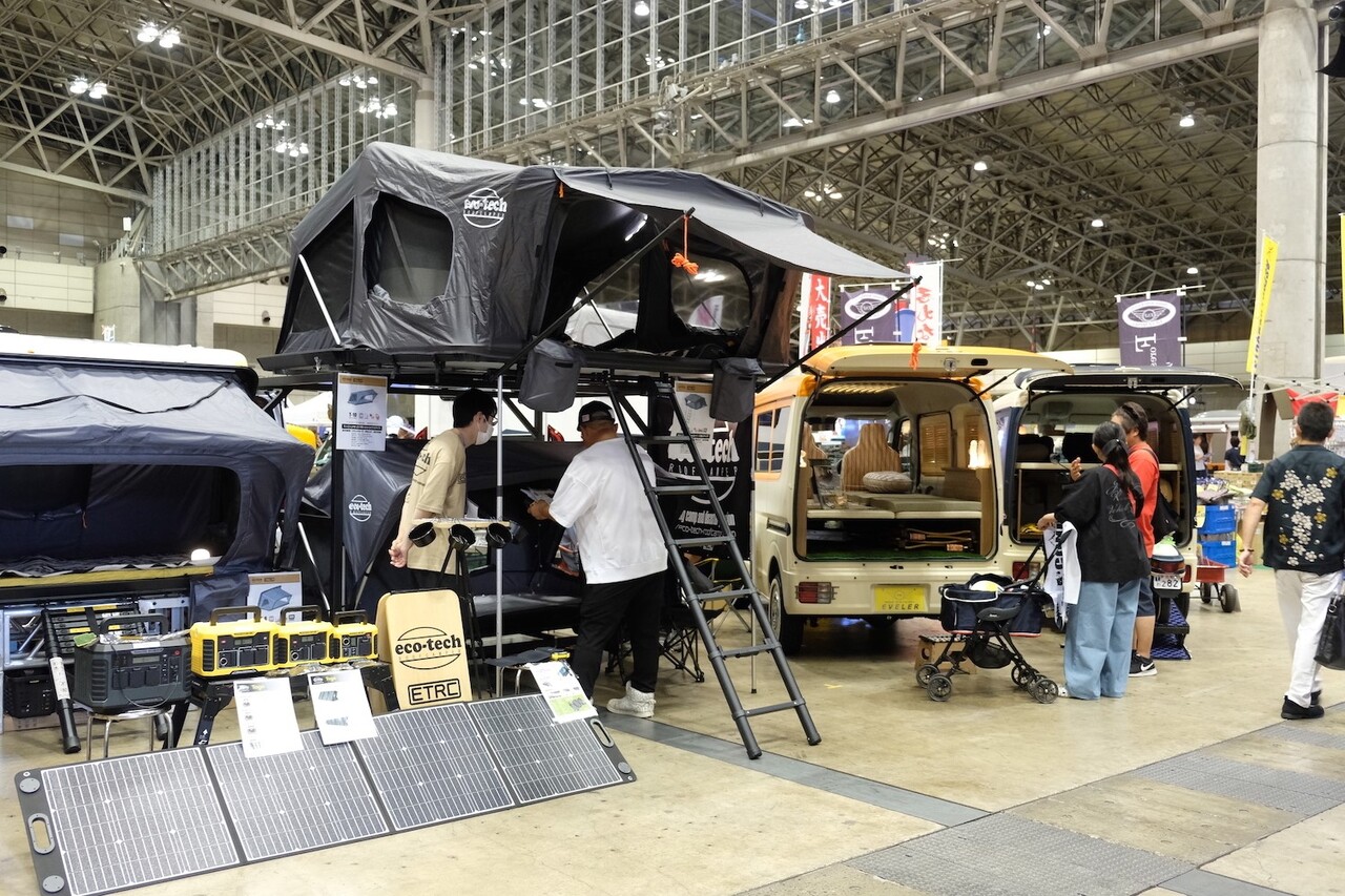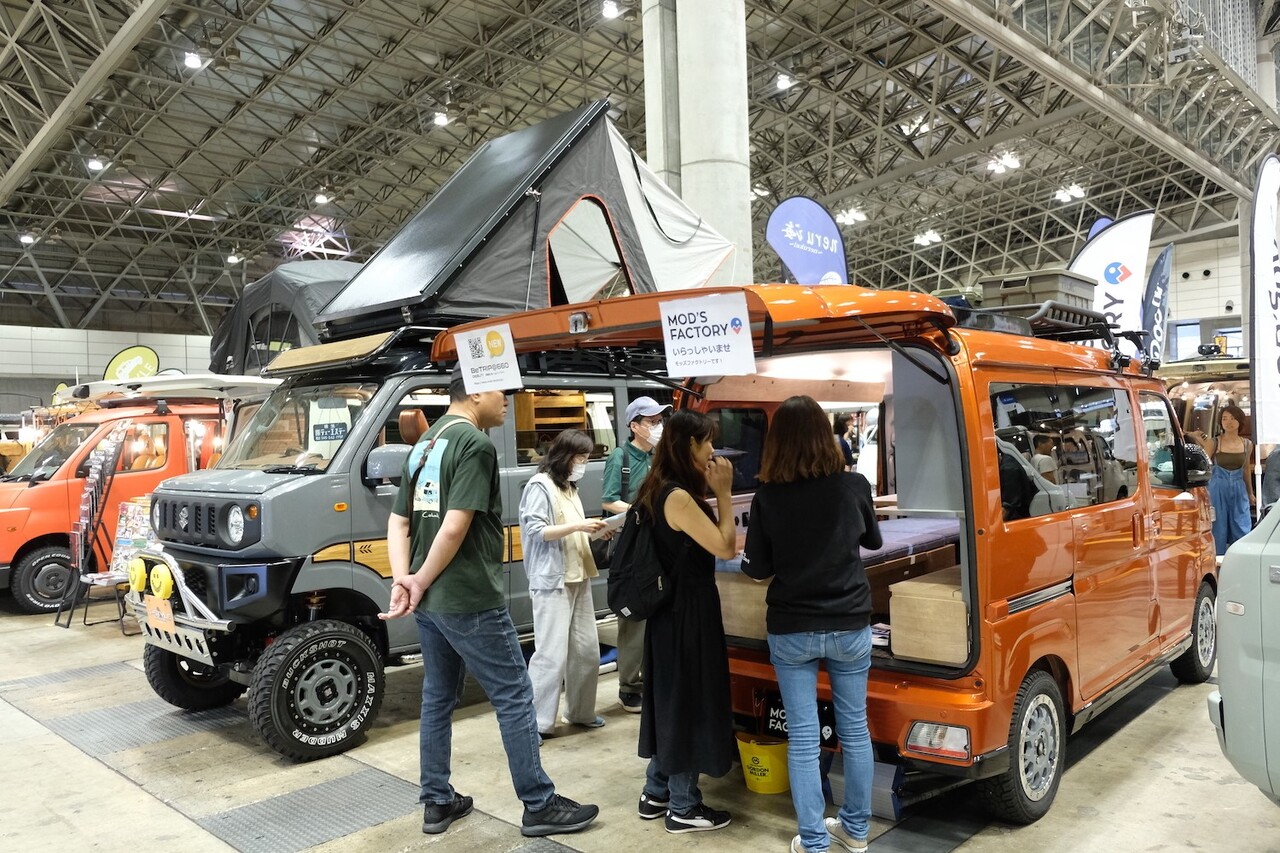 コロナ禍によって人気を集めたキャンプ。そこからさらに、車中泊やキャンピングカーなど「自分たち」だけの時間と場所を演出するキャンプ&外遊びの注目が高まってきています。そのことを証明するかのように、多くのキャンピングカーや車中泊仕様の車、そしてルーフトップテントが陳列されていました。そのひとつひとつを熱心にチェックするアソモビ参加者たち。キャンプ場のキャンプだけではなく、自分で旅のスタイルを決めていきたい。そんな思いの現れかもしれません。大型のトレーラーハウスやアメリカのスクールバスを改造したモーターホームは、中に入ることもできたことから、多くの人が中もチェックしようと並んでいました。