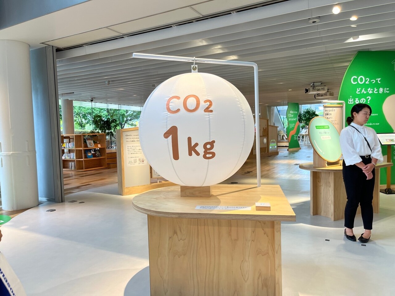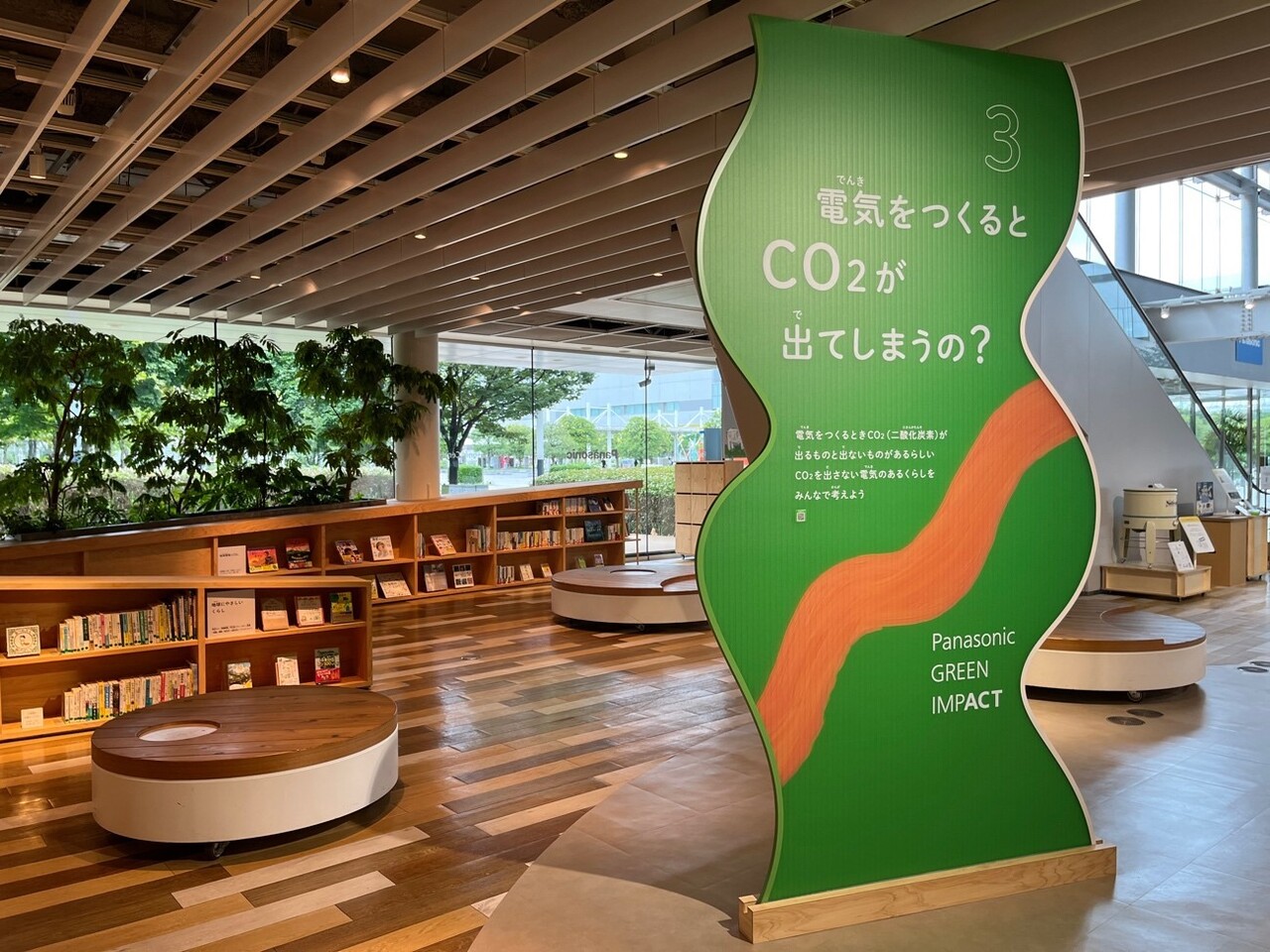 ライブラリーでは地球温暖化問題や資源の有効利用、SDGsへの取り組みにまつわる本が豊富に用意。子供向けの本も充実しているため、ファミリーで楽しめる空間となっている。