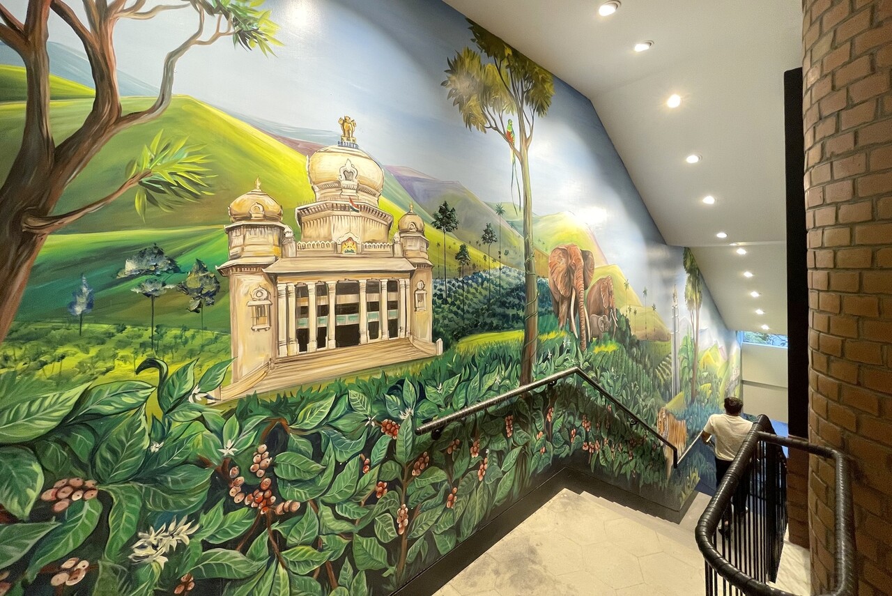 店内の2階に続く階段の壁に描かれていたアートが、これまたインドらしい。細部までこだわっている。