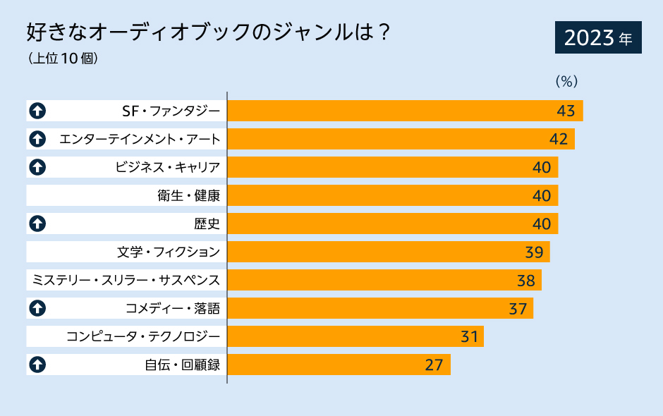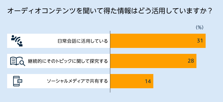 オーディオブックの人気のジャンルの変化も興味深いトピックです。文学・フィクションのジャンルは 2022年から2023年にかけてトップの座を譲り、SF・ファンタジーが第1位に浮上、エンターテインメント・アートが第2位、ビジネス・キャリアが昨年の第10位から第3位に上昇しました。さらに、データによれば、31%のリスナーがオーディオコンテンツを会話の中で活用しており、オーディオコンテンツから得た知識や物語を友人や家族と共有し、会話の糧になっていることがわかります。調査に回答した人々の28%がオーディオコンテンツを活用して新しい知識を習得し続けています。オーディオコンテンツは、興味を持つトピックについて深く学びたいという欲求を満たし、知識の積み重ねに役立っています。