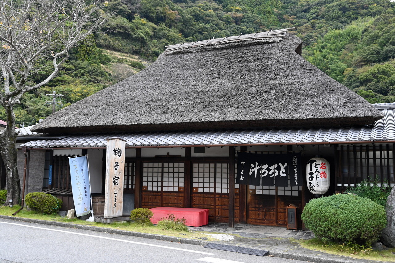 旧東海道沿いにある、昔ながらの茅葺屋根の建物。