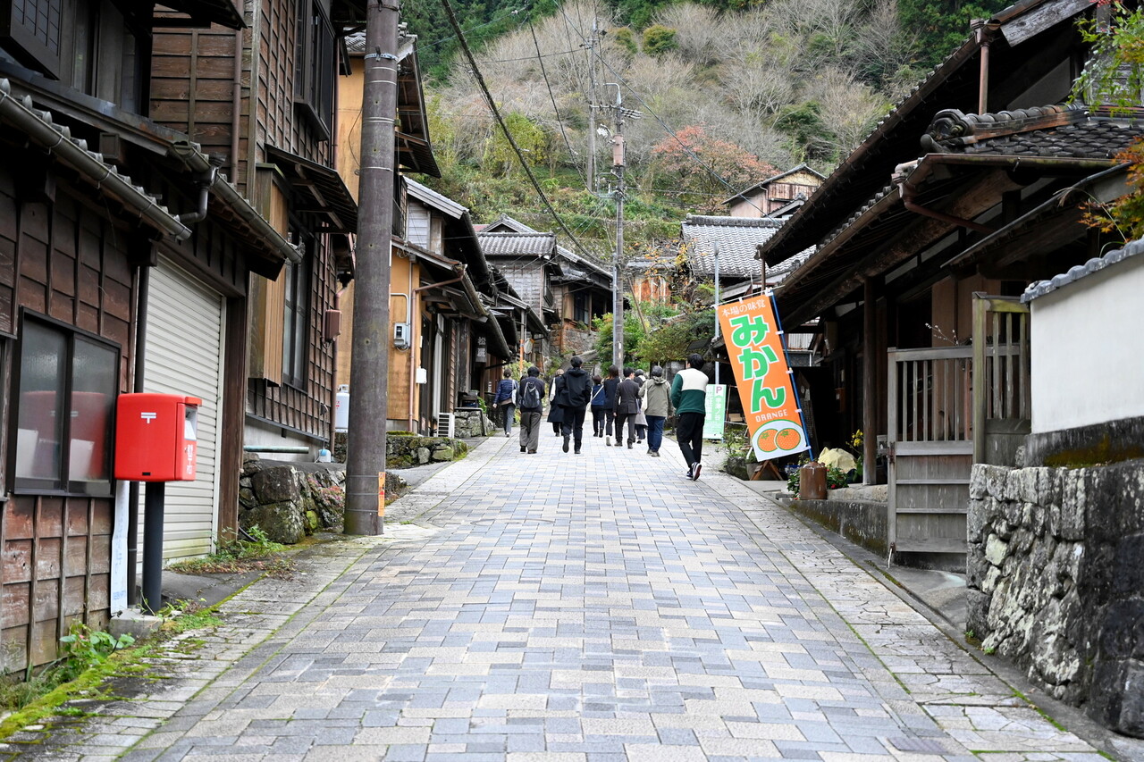 名物のとろろ汁を提供するお店「とろろ汁の丁子屋」(ちょうじや)には、昔も今も変わらず、次々と旅行客が出入りする様子が見られます。