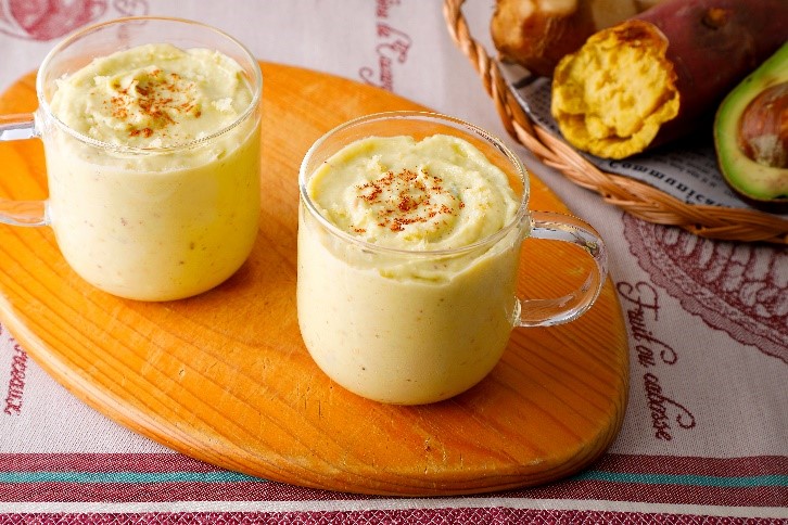焼き芋、アボカド、しょうがを豆乳とヨーグルトでわったスムージーで寒い季節にぴったりの一品!