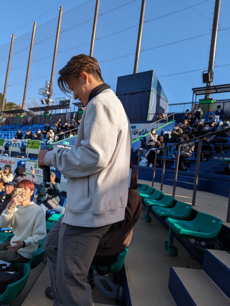 そんなこんなでイベント前から存分にオフの鎌スタを楽しんだが、肝心のイベントは12時30分から開始。登場したのは事前に発表があった通り二刀流・矢澤宏太選手(23)、金村尚真投手(23)、田宮裕涼捕手(23)の同級生3人組(昨年は万波選手の代打で急きょ田宮選手が出演するというアクシデントがあった)。しかも登場時は筆者の真横を通るという奇跡!!!近い!!!