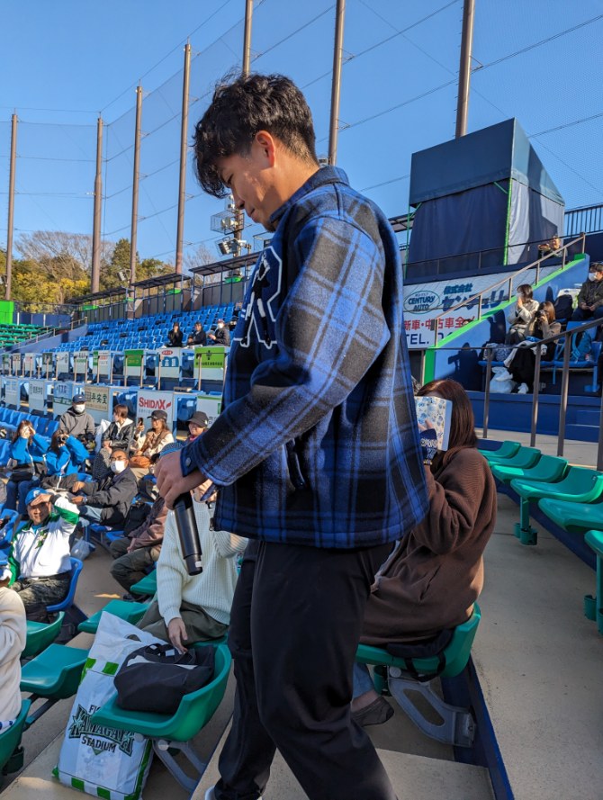 驚いたのが推しである清水優心捕手がグラウンドで黙々とランニングをしていた。実はこの前日の9日に北広島市でファンミーティングイベント(18:00〜19:30)があり、それに清水捕手は出演していたため、てっきりまだ北海道にいるものだと思っていた。しかし、最終便近い夜の便で関東に戻ったのだと思われる。こうして鎌ケ谷で朝早くから汗を流している姿を見て、来季にかける気持ちが伝わり、胸が熱くなった(手を振ったら振り返していただきました。ありがとうございます。)