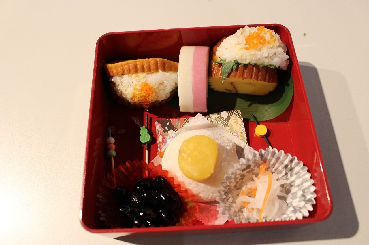 また知識が増えるという願いがこもる伊達巻に、がりしょうがやごまを混ぜた酢飯を挟んだ伊達巻寿司に黒豆、なます、栗きんとんとクリームチーズの大福の5種類のおせち料理をお重に詰め込んだ。