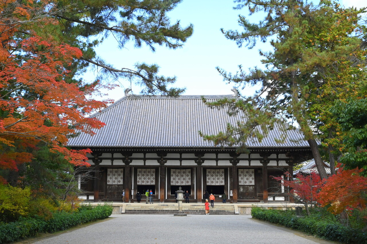 そして、「唐招提寺」は「金堂」が制定された。南大門から参道の中央付近から金堂の全景を撮影できる。8世紀の金堂建築で最高傑作。天気が良い日は金堂上の空を広めに撮るとなおいい。特に、秋は紅葉も美しい。
