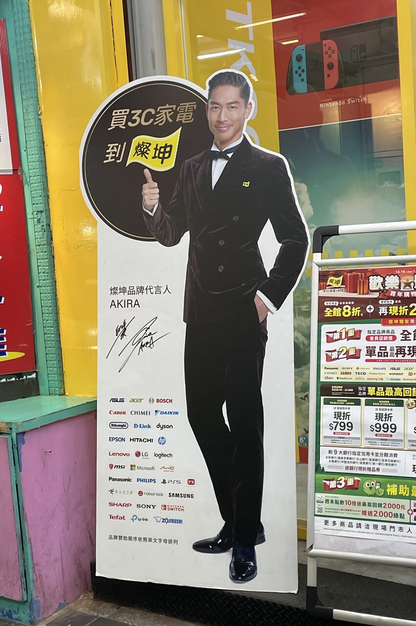 台北の家電販売店で見かけた、EXILE・AKIRAの等身大パネル。