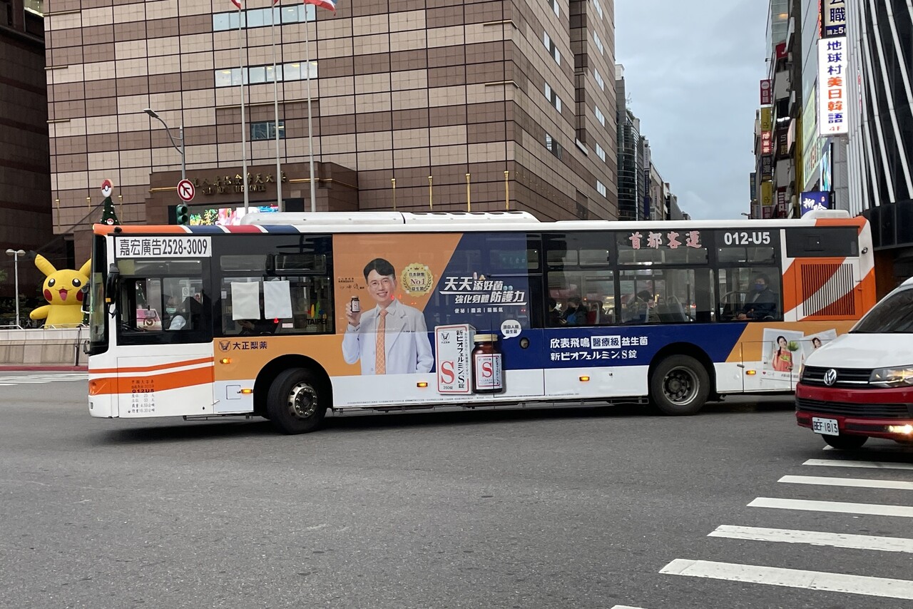 例えば、台北市内を走る路線バス。ラッピング広告をよく見ると大正製薬の「ビオフェルミンS」である。