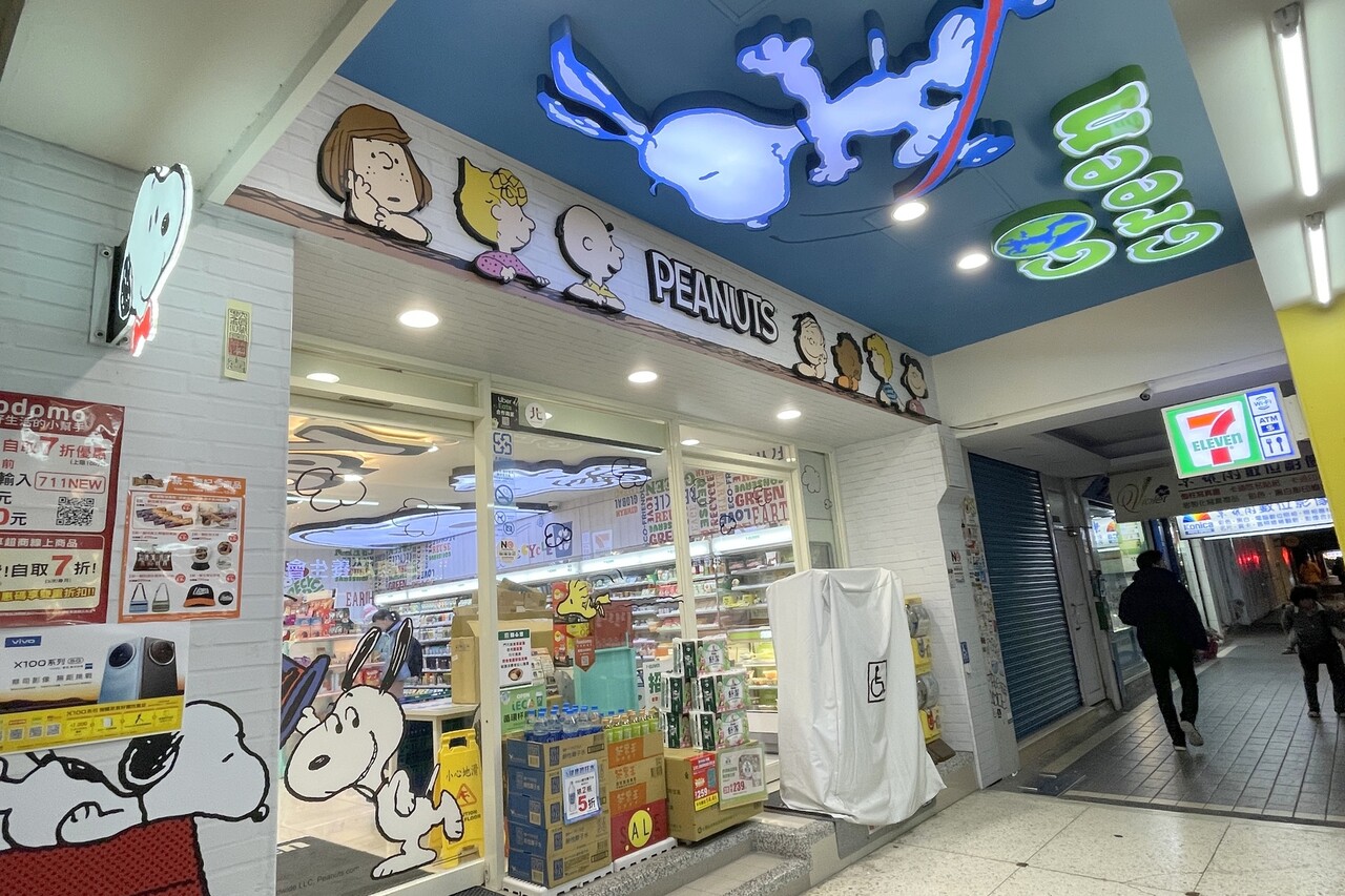 続いて紹介するのは、誰もが知る人気キャラクター「スヌーピー」とのコラボ店舗。台北駅近くのセブンイレブン、「7-ELEVEN ※華福店」店である。※金が3つでキンと読む中国語