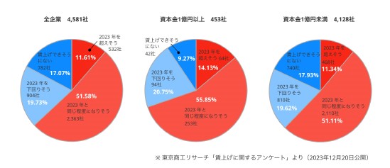 東京商工リサーチの調査によると、2024年の賃上げが前年を超えそうと回答した企業は1割程度で、「賃上げできそうにない」と回答した中小企業は大企業の約2倍にも上ります。その要因として、ロシアによるウクライナ侵攻に端を発した物価上昇や、原材料費の高騰などが挙げられますが、そもそも日本社会が抱える賃金据え置きの企業体質がバブル崩壊以降、ずっと続いている状況が常態化しているともいえます。