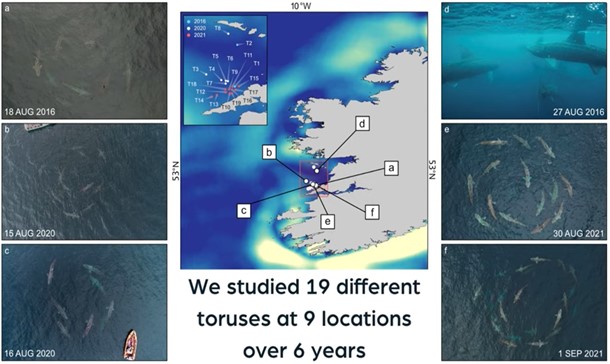 アイルランドのウバザメ研究グループと、英国の海洋生物学協会の科学者たちの調査で、通常は単独で行動するウバザメが、夏の繁殖期に大きなサークルのような集団を作り、水中を旋回しながら配偶者を見つけることが判明した。調査チームは2016年から2021年にかけて、アイルランドのクレア州沖で水中カメラと空撮ドローンを使い、ウバザメがゆっくり旋回しながら泳ぐ19の旋回グループを撮影した。ドーナツ状にサークルを組むサメは成熟した雄と雌で、集団は6〜23匹のサメで構成されていた。お互いの後を追いかけながらゆっくり旋回、数分以内に他の個体と関係を持っていくという。ウバザメの求愛サークルは数日間、もしくは数時間で終わることもあり、高速で相手を探すサメのスピードデートと言われている。