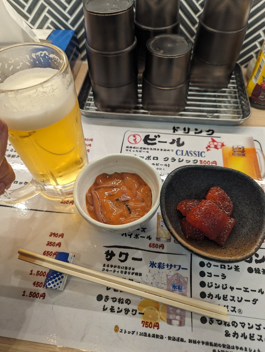 向かったのは「海味はちきょう エスコンフィールド店」(いくらのつっこ飯で有名なお店)。イートインスペースもあり、午前中なのに塩辛と筋子という塩分爆発な2品を注文し、ビールを楽しむ。この写真だけ見ると、ただの居酒屋のカウンターにしか見えないが、球場の中のテナントです!!!