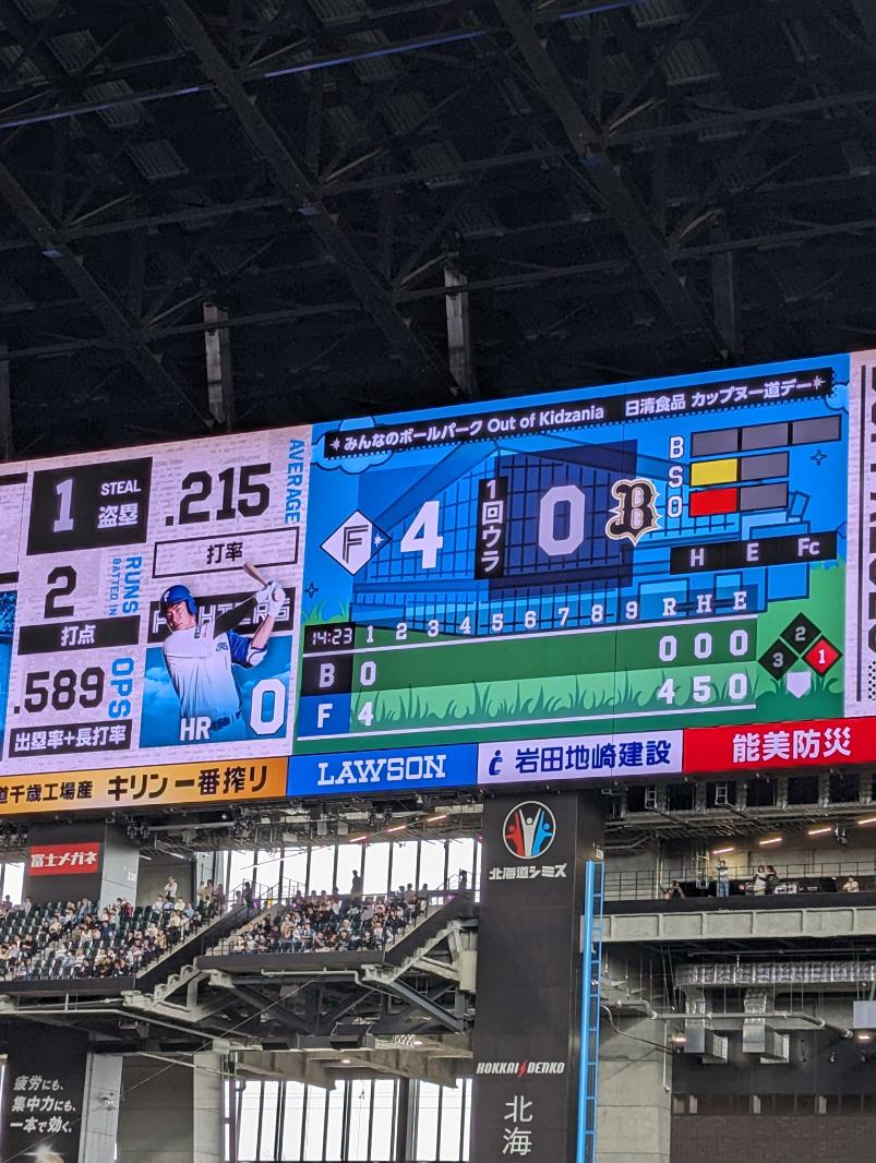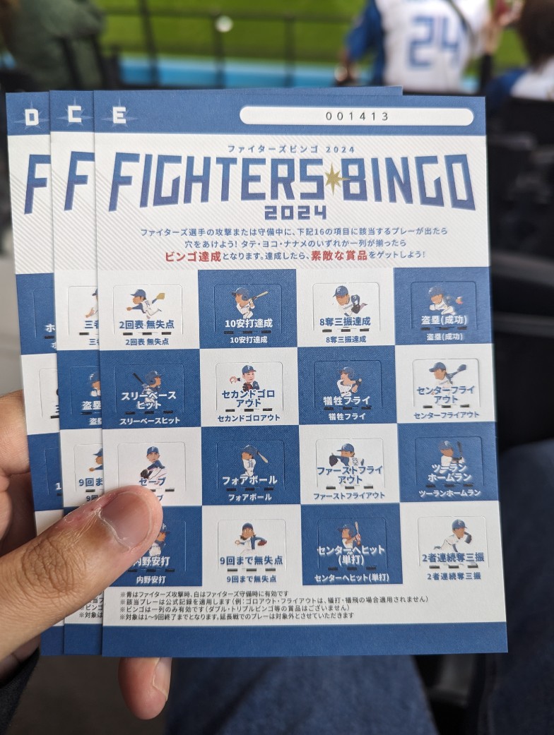 試合はファイターズが初回に4点を先制!守備もカチカチで0失点で試合が進み、終盤にはまたファイターズ打線が爆発。結局17安打、9-0での完勝。購入したビンゴカードも2/3でビンゴに!