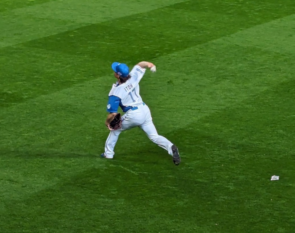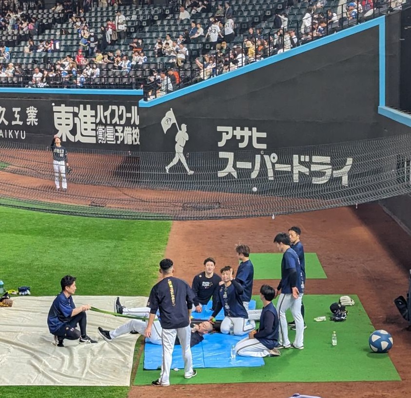 練習中のオリックス投手陣や、外野でキャッチボールをするこの日先発の伊藤大海(「海」は正しくは毎ではなく旧字体の母)投手が目の前に。近いっっっ!