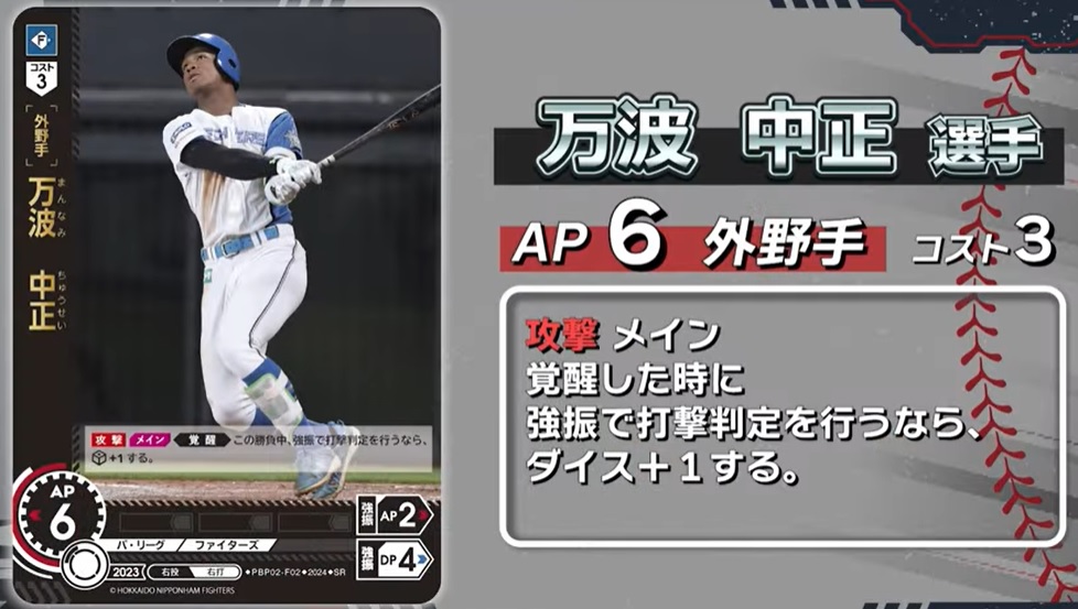 ファイターズ新カード2枚目は強肩強打で大注目の万波中正選手。コスト3でAPは6の外野手。サポート値は強振AP2、強振DP4!覚醒したときに強振の出目+1という能力。