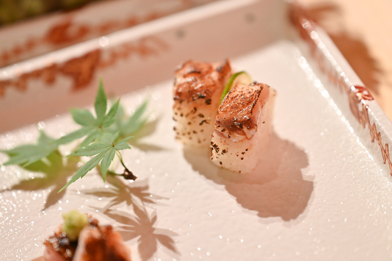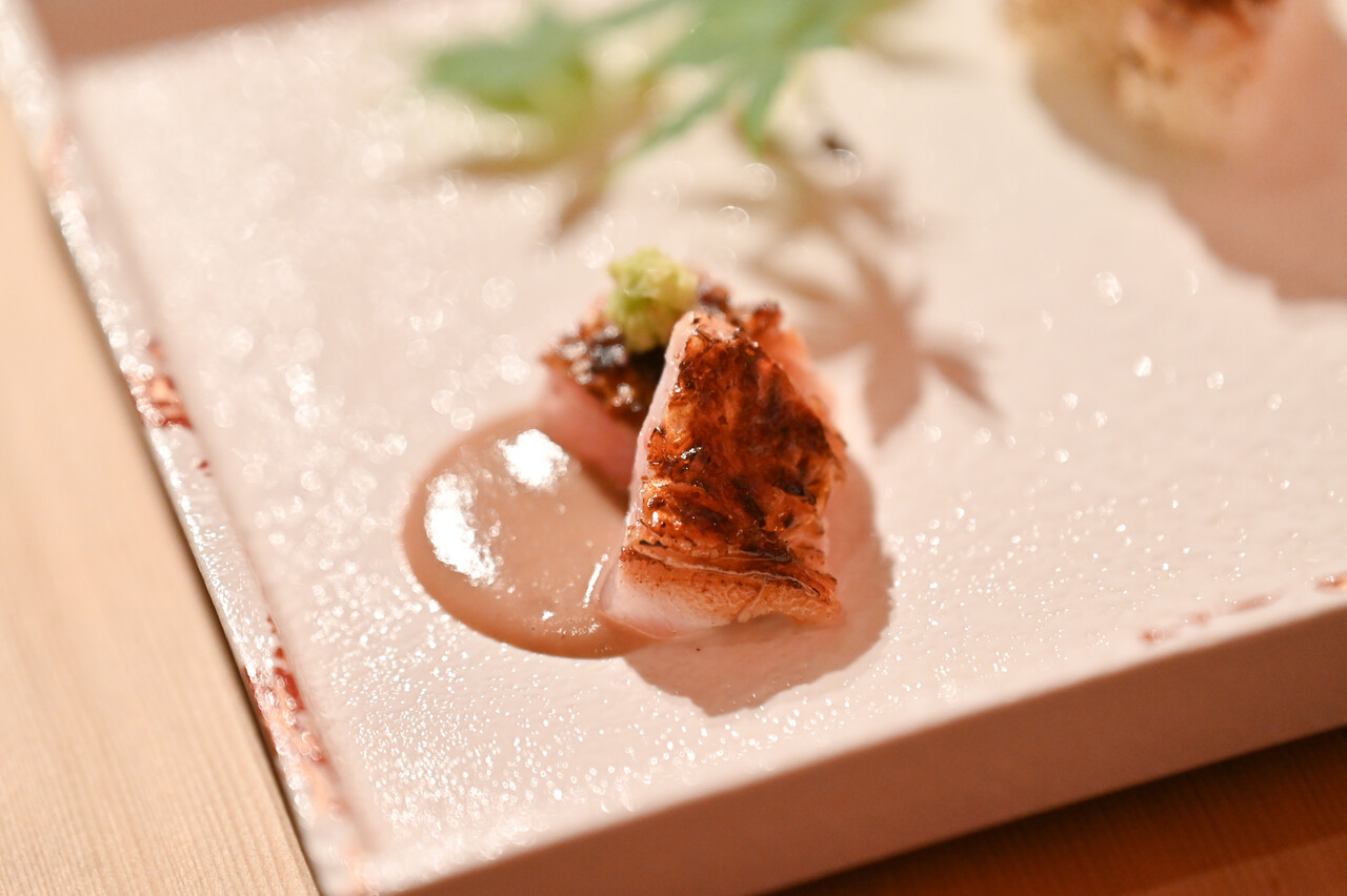 お披露目会では「のどぐろ松笠焼き 焼き霜お造り」と「のどぐろ棒鮨」の二品の試食をすることができました。調理してくれたのは新潟県村上市にある「料亭 能登新」の11代目店主の山貝誠さん。お造りは鱗が付いた状態に切り分けたあと、鱗の部分を瞬間的に焼き上げたという逸品。丁寧に取り扱われた美宝だからこそ、このような調理法が可能とのこと。鱗が付いた状態のお造りなので表面は香ばしく、複数の食感を楽しむことができます。味はというと脂がしっかり乗っており、肝を溶かした醤油につけて食べると口の中に旨味が広がります。これまで食べてきた他ののどぐろとは違う、格別の美味しさがありました。