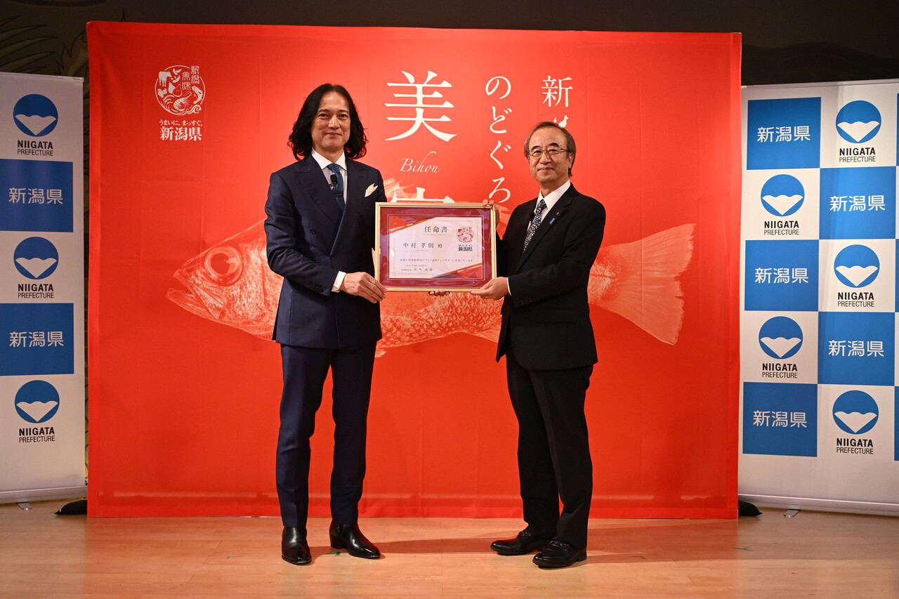 新潟県推進ブランド品目アンバサダーに任命された美食家でコラムニストの中村孝則さん(左)