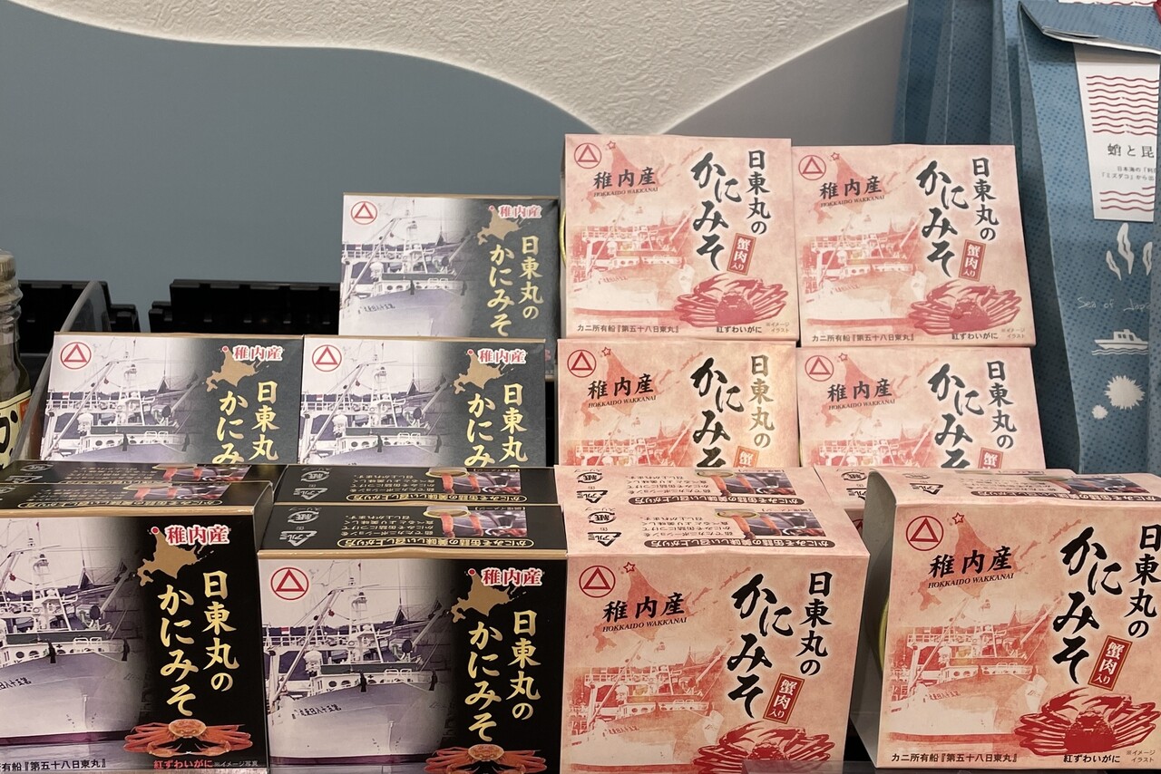 いつでも手軽に味わえる、かにみその缶詰はお土産としておすすめの一品。北海道・稚内産、高級の紅ズワイガニを使った「日東丸のかにみそ」は、蟹肉入りでゴロゴロとした食感は食べごたえある。