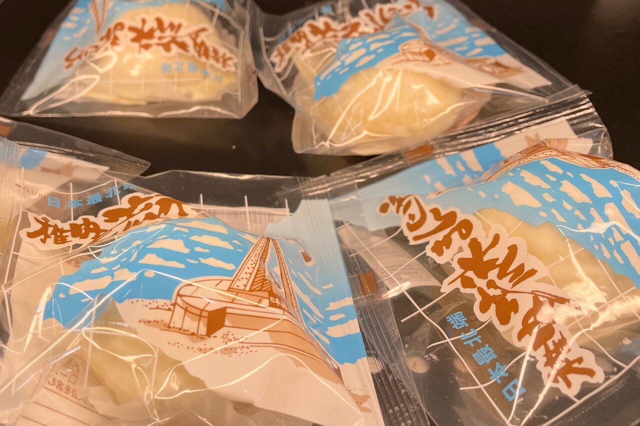 稚内にある菓子店「御菓子司 小鹿」の定番商品「流氷まんじゅう」は、駅や空港などだけでなく、スーパーマーケットだと個包装で1個単位から買えることも。宗谷岬を流れる流氷をイメージし、スポンジケーキにホワイトチョコレートをコーティング。できる限り北海道産の素材を使うこだわりも。まんじゅうという名称ながら、中にあんなどは入っていない。