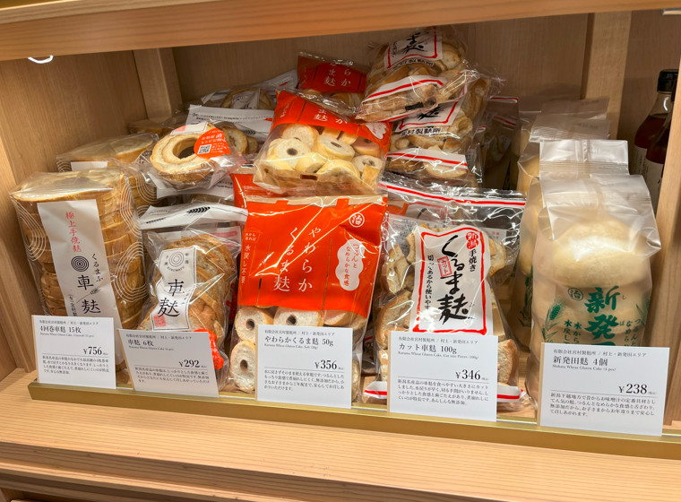 ビルの1階と2階は物販フロアになっており、1階には新潟県内で収穫された野菜や果物、お米、冷凍食品やお菓子、各種加工品など様々な新潟グルメが大集合。施設のロゴをあしらったオリジナルのお菓子も販売されている。