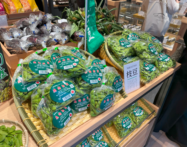 入口付近には新潟の夏を代表する農産物の一つである枝豆と、枝豆を使用したお菓子が鎮座。