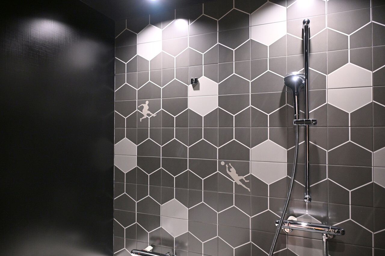 また、客室内の廊下や、バスルームの壁などもよく見ると、サッカーボールのデザイン。こういったこだわりも、サッカー好きにはたまらないはず。