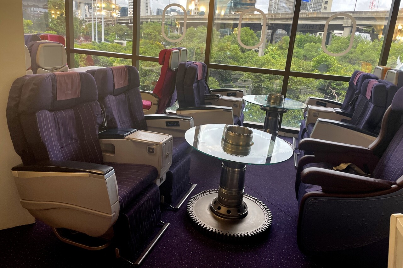 座席が飛行機そのまま。普通のベンチもあるが、エコノミークラスもあれば、ビジネスクラスの座席もある。飛行機で使わなくなって余ったのか、航空会社だからあえてこの座席なのかは謎だが、この非日常感はなかなか楽しい。