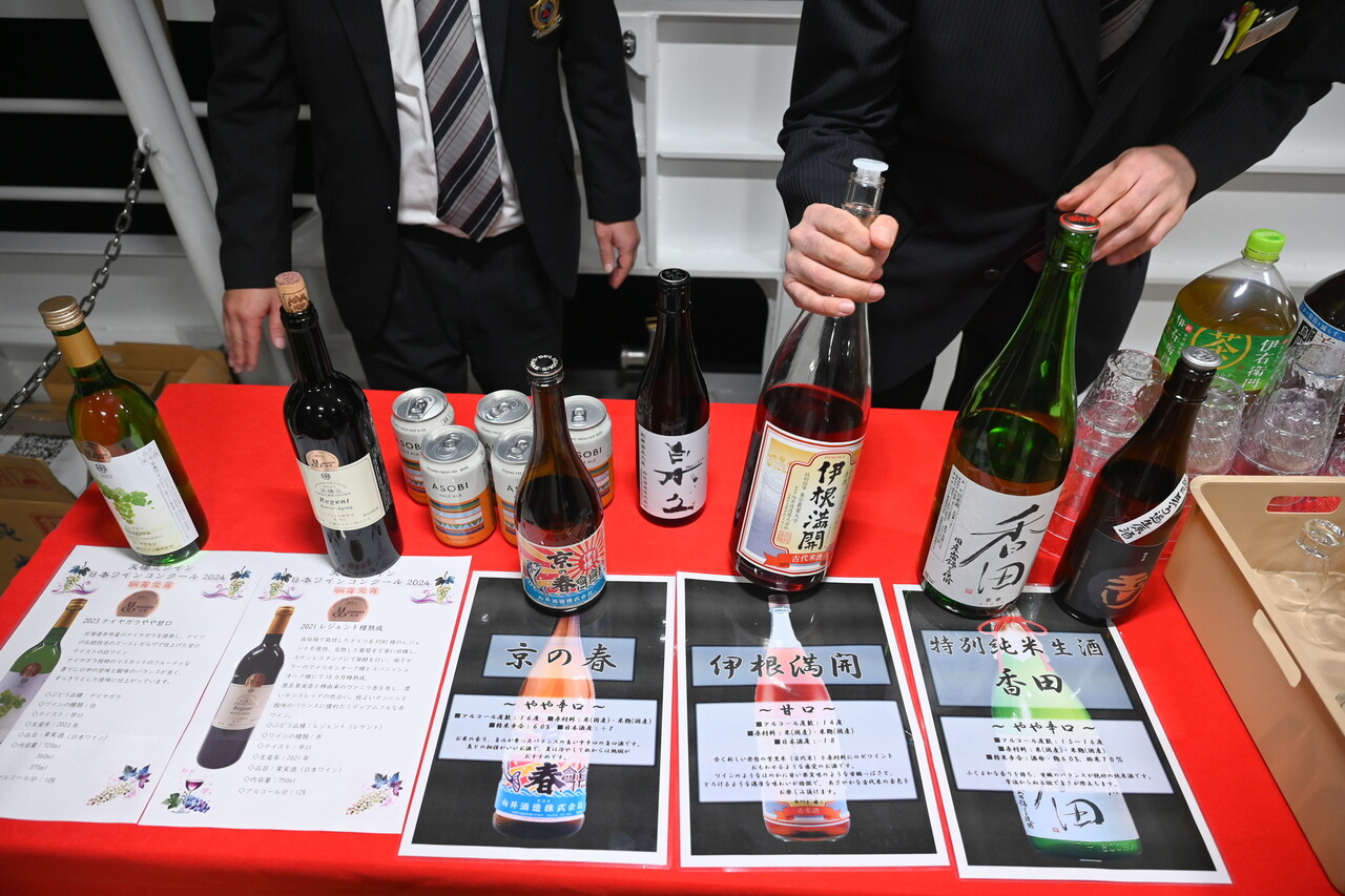 さらに船内に設定された「宮津BAR」の体験も、なかなか贅沢。地元の宮津市や伊根町の酒蔵「ハクレイ酒造」「向井酒造」の銘酒、天橋立ワイナリーの地ワイン「ナイヤガラ」、与謝野町のクラフトビール「ASOBIペールエール」(かけはしブルーイング)など、丹後エリアの美酒が勢ぞろい。