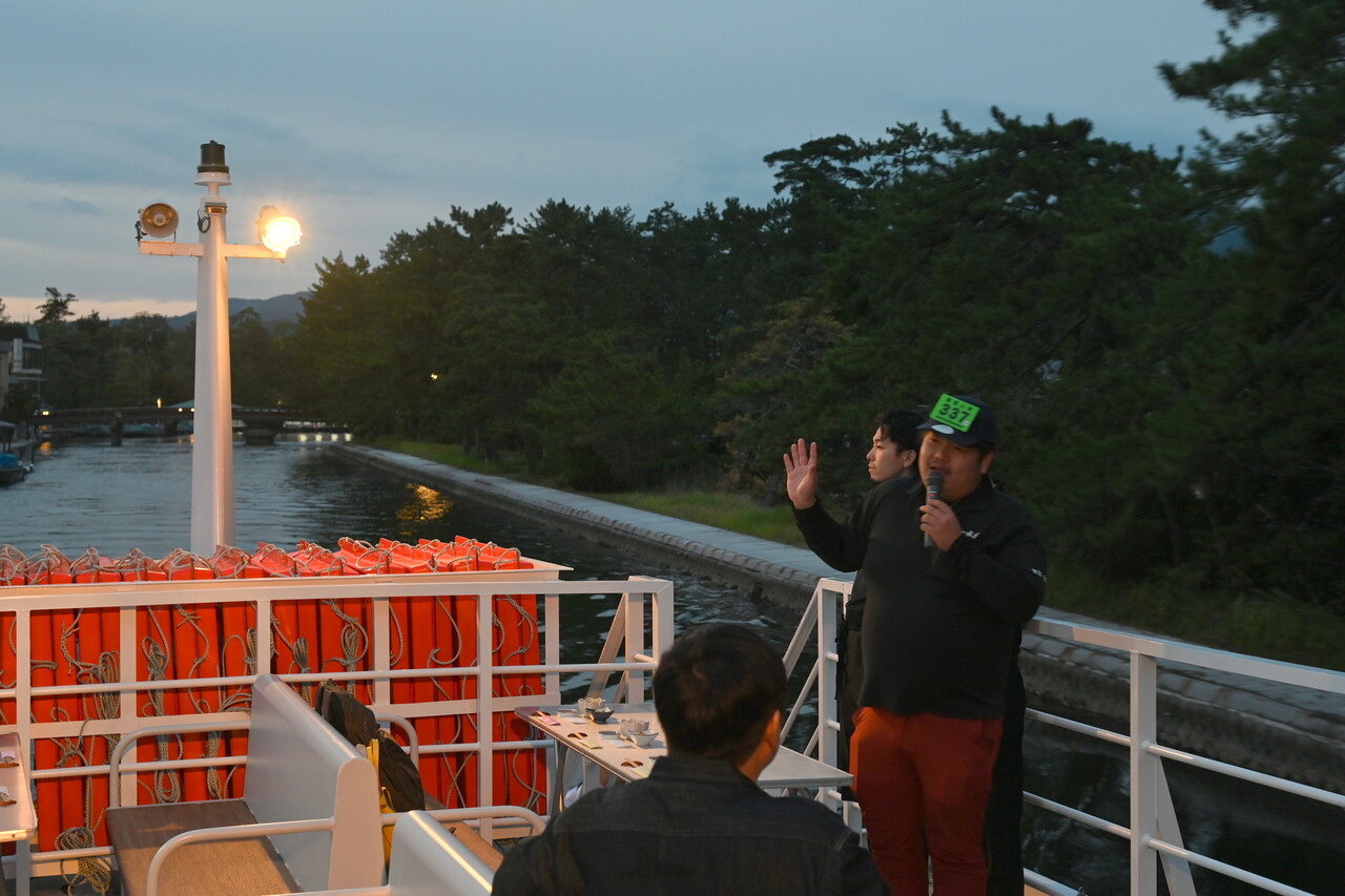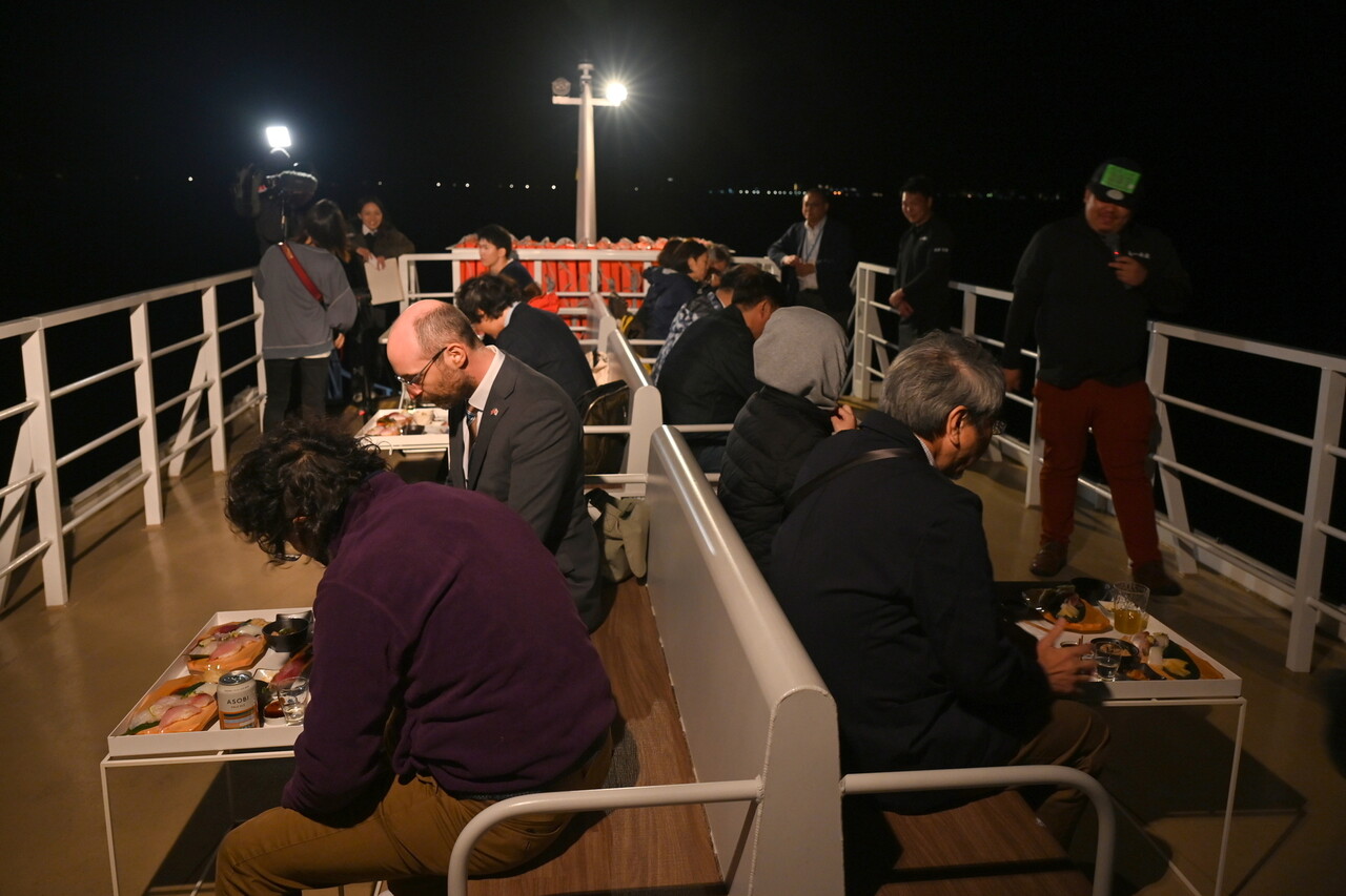 今回参加したクルーズは、湾内に出るとすでに夜だった。それ以前に開催だと、天気が良ければ天橋立と夕景を楽しみつつ、寿司とお酒を味わうことができたという。
