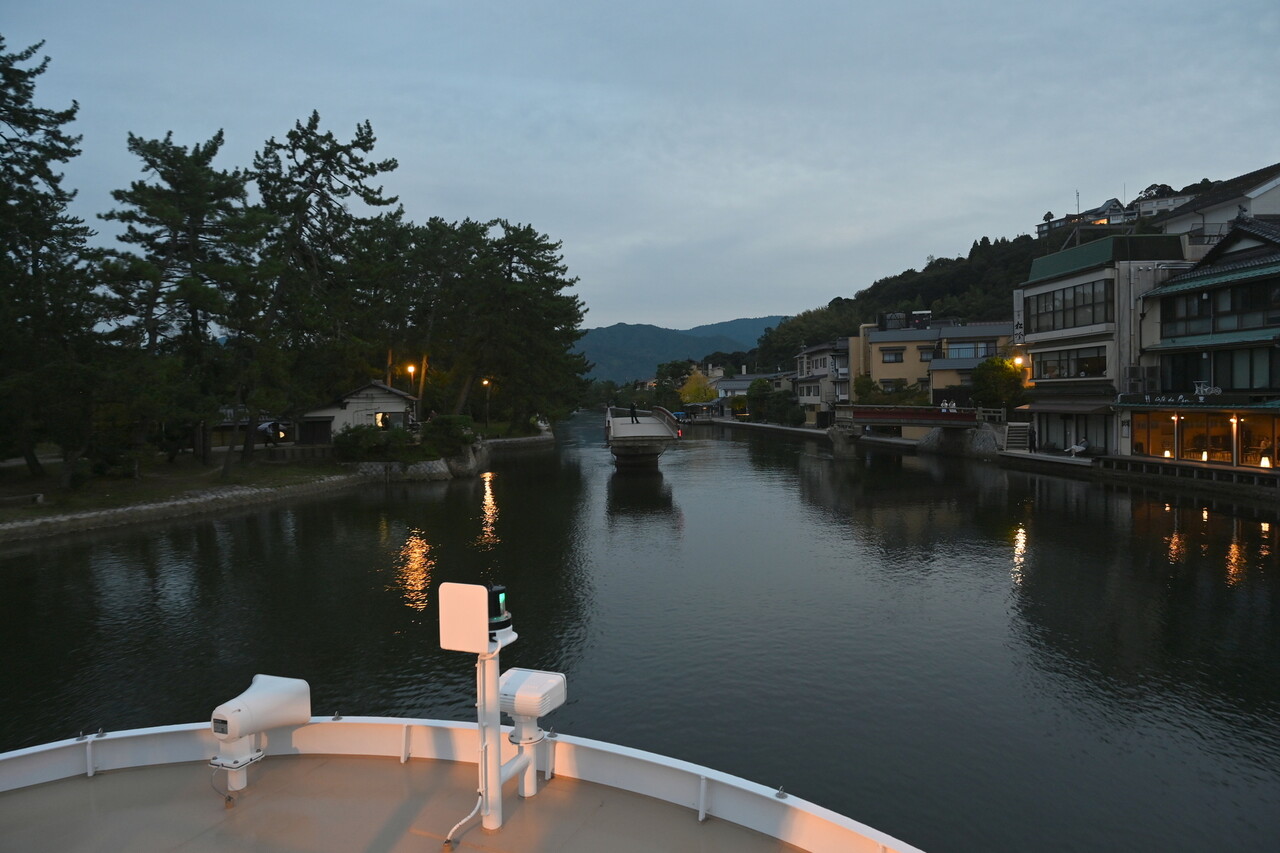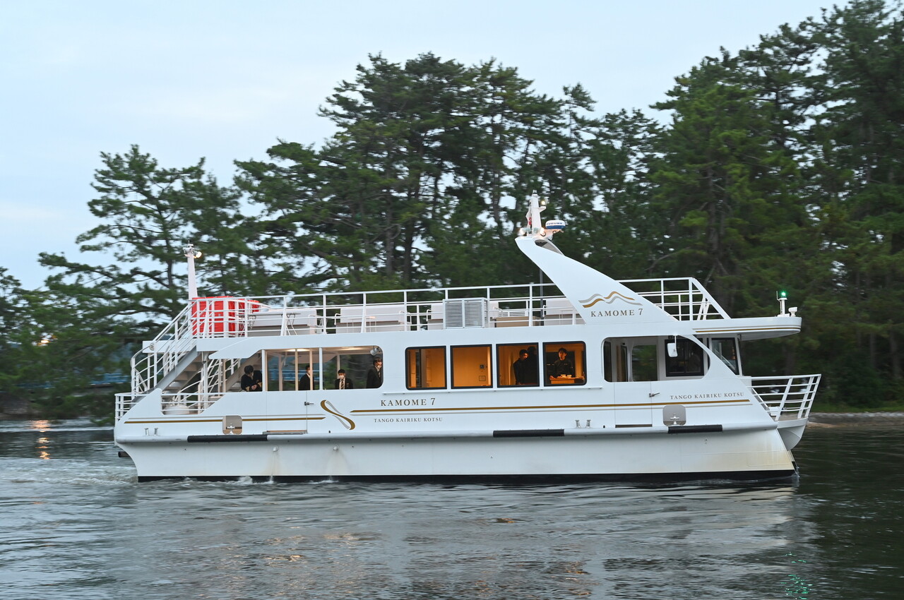 京都丹後鉄道の天橋立駅からほど近い、宮津桟橋を17時過ぎに出発。船は、2023年8月に就航したばかり、丹後陸運交通の観光船「KAMOME7」である。