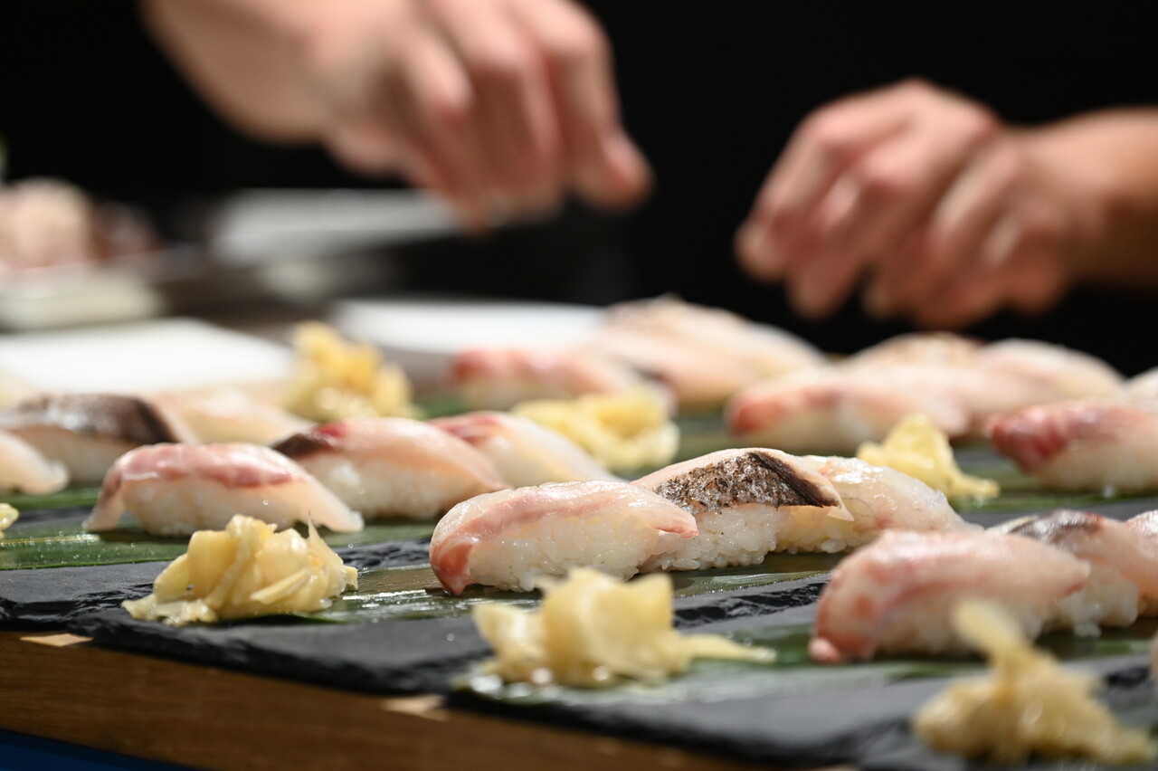 寿司に使われる魚介は、黄金アジと呼ばれる「瀬付きアジ」、全身トロガツオで市場にあまり流通しない「ヒラソウダカツオ」、関西では西のフグとも称される高級魚「キジハタ」など。その他「カンパチ」「アオリイカ」「アカアマダイ」と合わせて6貫が、1皿目で提供された。