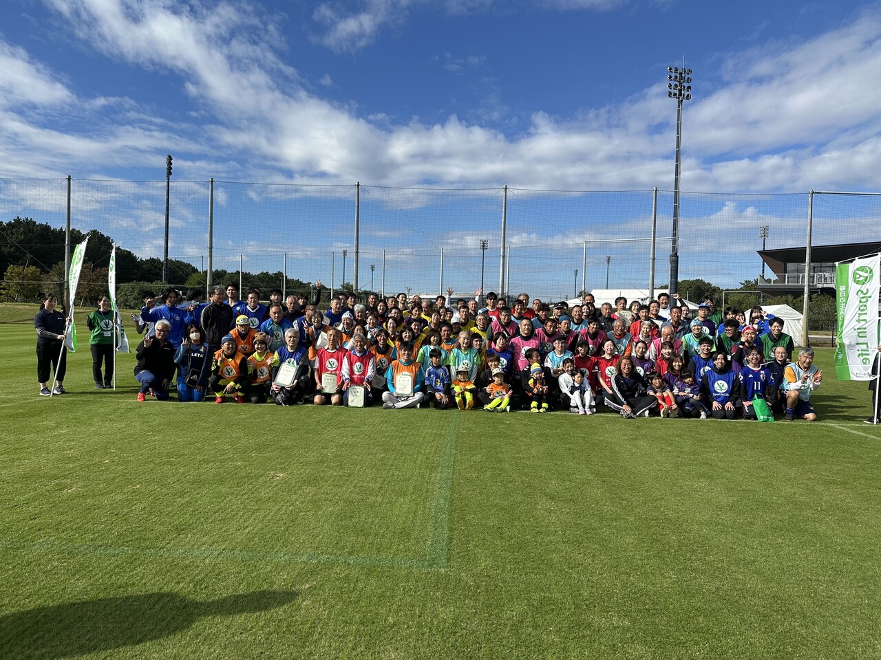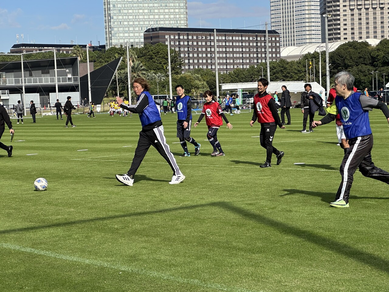 スポーツ庁の「Sport in Life推進プロジェクト」の一環で2024年11月9日、走らないサッカー「ウォーキングフットボール」イベントが千葉県の高円宮記念 JFA夢フィールド を会場に開催されました。当日はサッカー元日本代表の岡野雅行さんや佐藤勇人さん、サッカー女子元日本代表の小林弥生さん、宮間あやさんがゲスト出演。4歳から71歳までの約90人が16チームに分かれ、熱戦を繰り広げました。