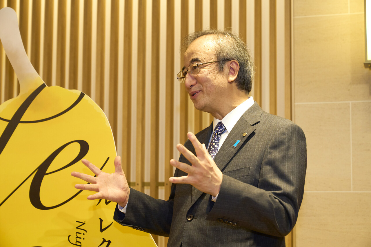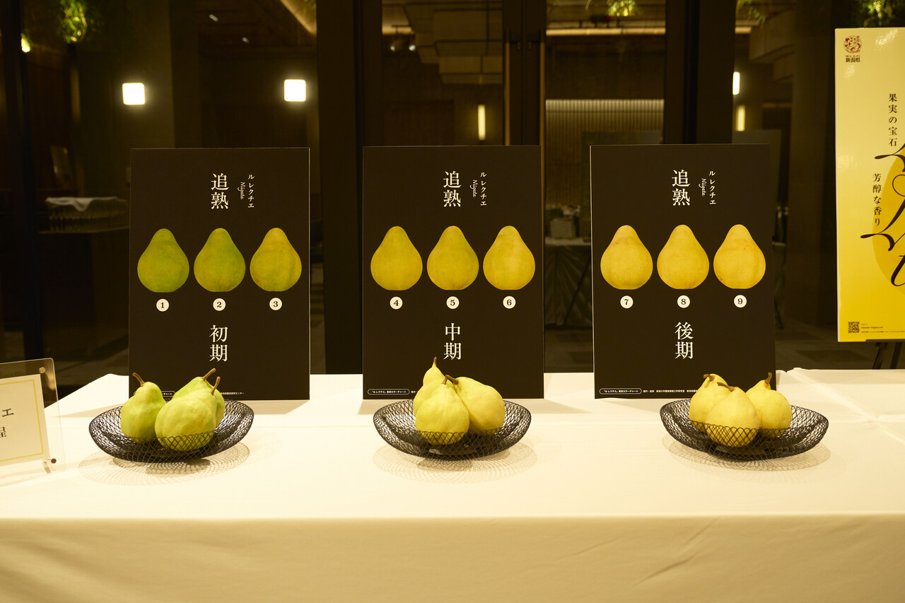 花住知事は「ル レクチエは最高級な果物だと思っています。香水のように香りが強く、甘みが強く、そして舌ざわりがよいのがル レクチエの魅力です。全国の生産量の8割ほどが新潟県で栽培されているものなのですが、残念ながら全国的にはご存じない方がまだまだ多い。ということで、是非多くの人にル レクチエという素晴らしい果物の魅力を知ってもらいたい、多くの人に味わってもらいたいということで今回のイベントを開催いたしました」と熱く話しました。