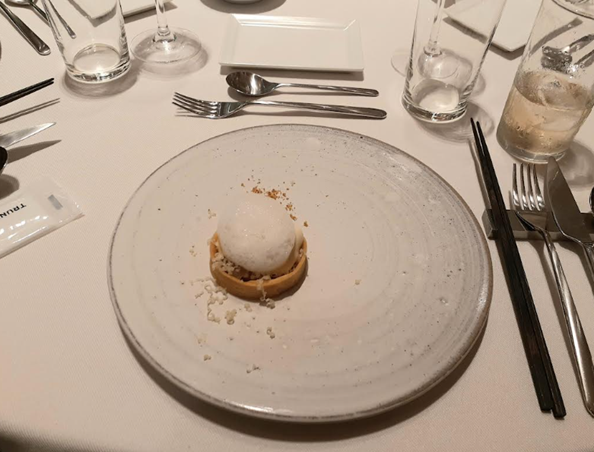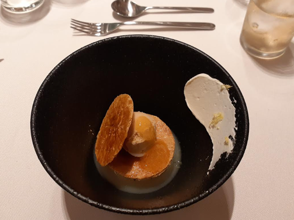 提供メニュー 「ル レクチエと軽く仕上げたムース バニラ風味のジュレで覆って蜂蜜とスパイスのグラス(アイスクリーム)を添えて」