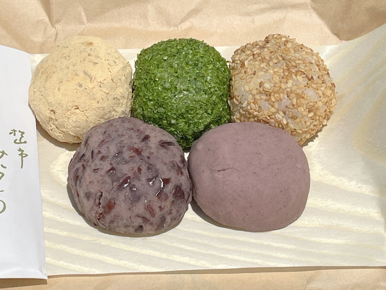 みよしのの看板商品ともいえるのが「五色おはぎ」である。これをピンポイントで、テイクアウトで買った。ちなみに、店内は狭いものの、その場で味わうこともできる。
