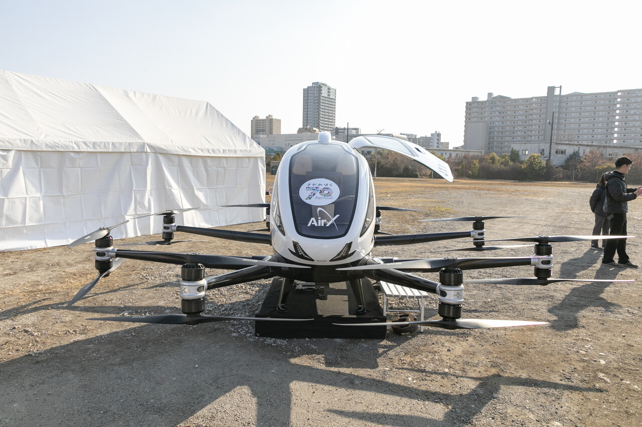 ヘリコプターを運航するAirX(本社・東京)が所有するこの“空飛ぶクルマ”は中国製で、16個のプロペラで約30キロの飛行が可能との事。現在は無人での試験飛行を重ねながら、国内での実用化をめざしている状況。