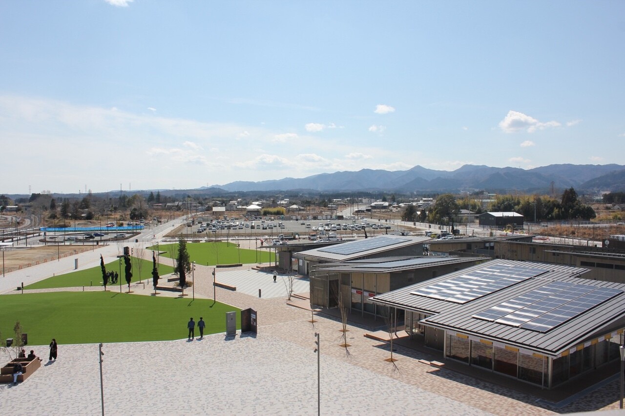 この地区は、「⼤野駅⻄交流エリア」と名付けられ、復興の象徴となる拠点の整備が進められてきました。かつては商店街があり街の中心地でしたが、震災後に建物の多くは解体され更地になってしまっていました。そこから、商いの場や集いの広場を再⽣させ町の⽞関⼝としての機能を取り戻すため「商業施設」を、町内での事業を再開したい⽅や復興業務に携わる拠点を町内に置きたい⽅に向け「産業交流施設」の建設が進められてきました。