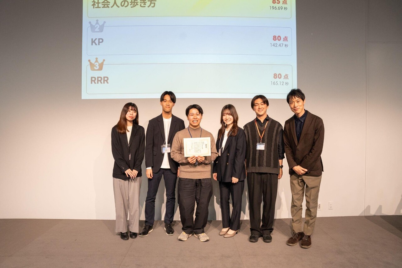さらに、「アイスブレイクコンテンツ」として、あの「QuizKnock」を運営する株式会社batonと入社式プロジェクトチームが作った11問のクイズでバトル。各テーブルごとにチームで解答。内容はビジネスメールの間違い探しや、スタートアップ関連の用語に関する問題など。優勝したチームには表彰も。