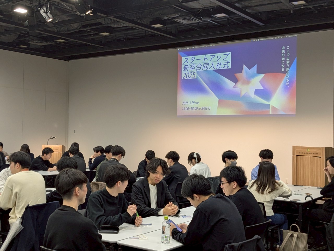 会場には多くの机と椅子が整然と配置され、参加したスタートアップ企業の新入社員がランダムに6名ずつのグループに分かれ着席。緊張感が見受けられることはなく、席に着くとすぐに軽い会話が始まり、リラックスした雰囲気が広がっていました。