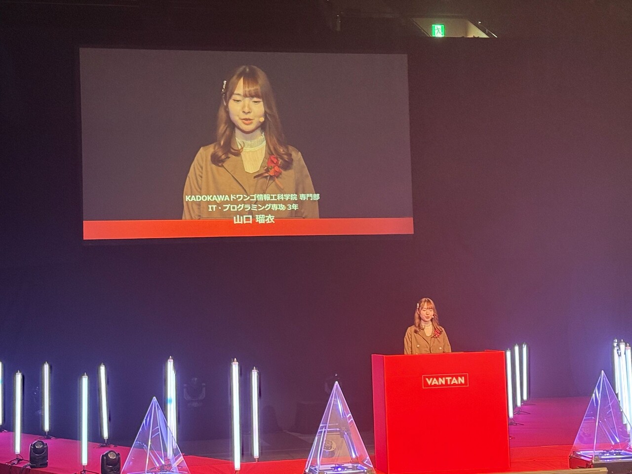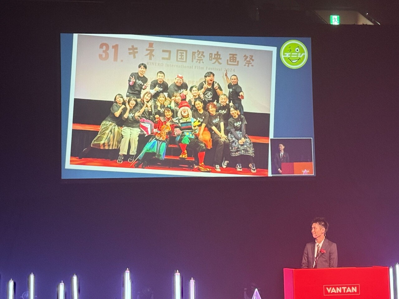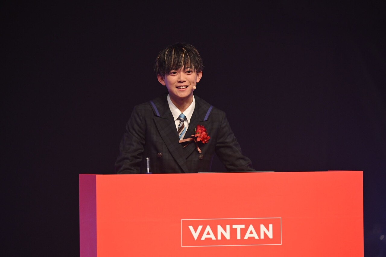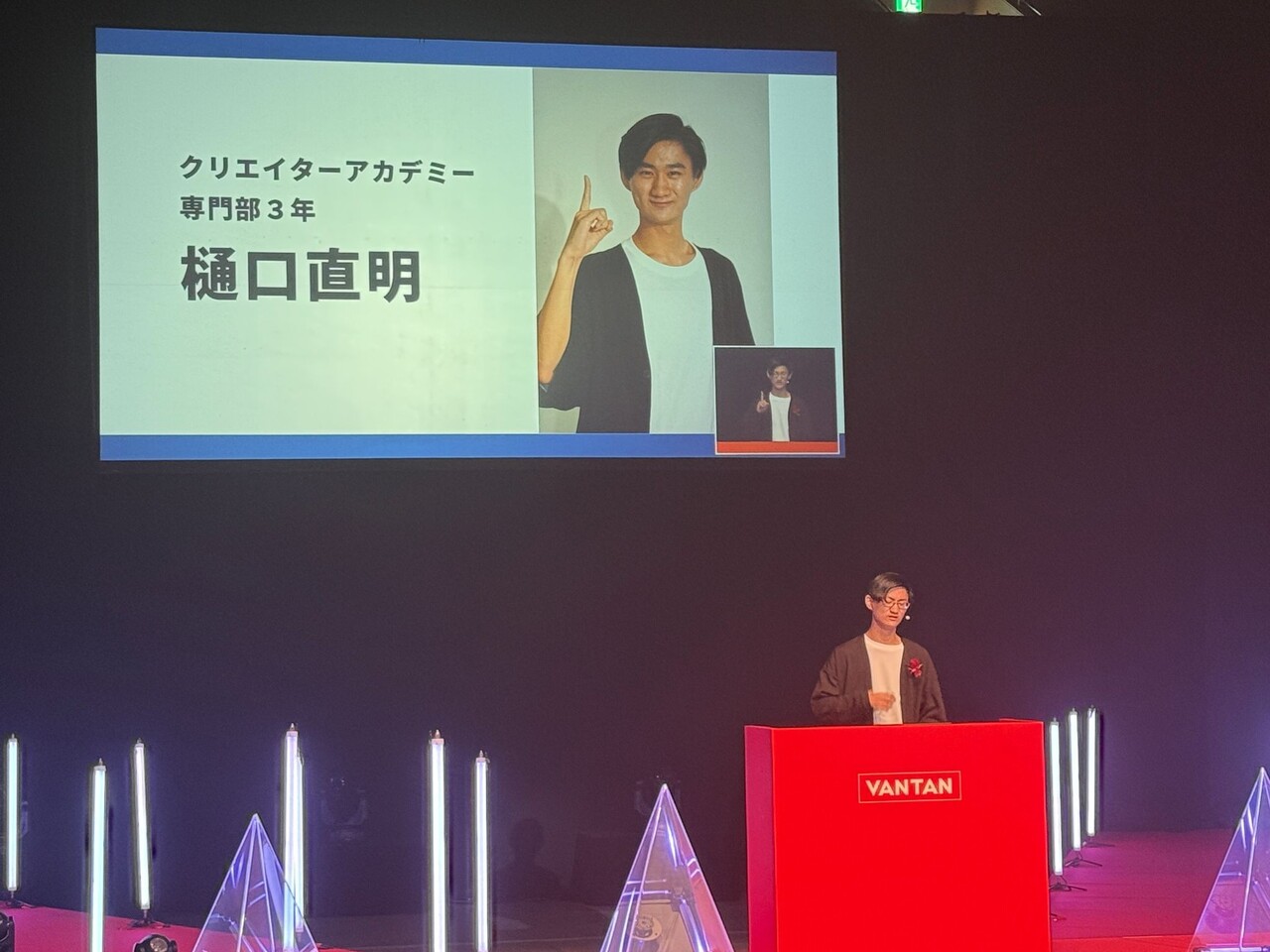 その後、株式会社バンタン取締役の吉岡忠樹氏の祝辞で「バンタンはフランス語の20歳を意味するバントンから来ている。若者をサポートする組織」や「人のつながりを大事にすること」が伝えられた。