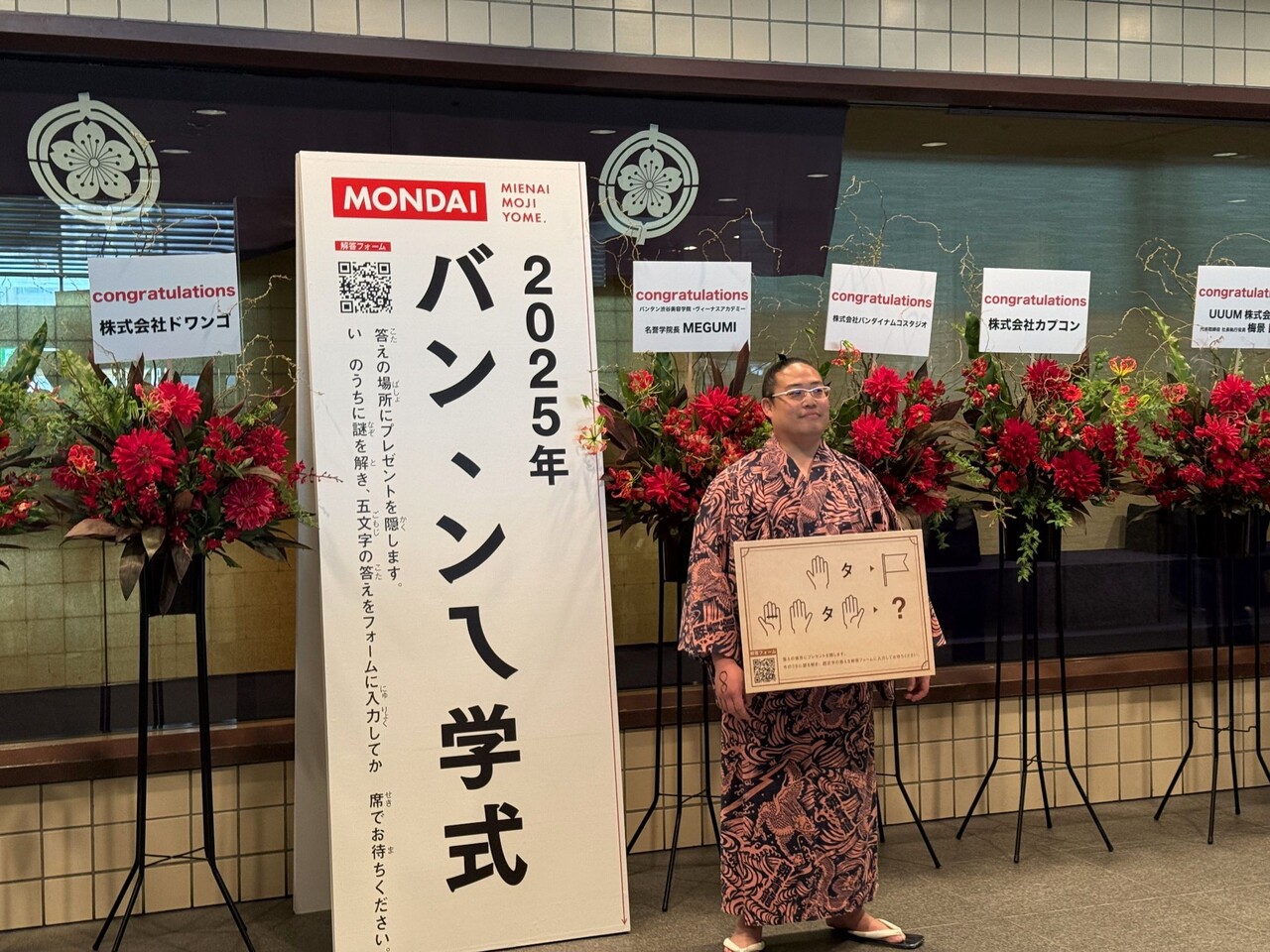 会場には怪しげな文字を手に書き込まれた力士や、文字がかけてしまった「バンタン入学式」の看板が配置。それもそのはず、今回の入学式は、バンタンゲームアカデミーの名誉アカデミー長に就任した謎解きクリエイター・松丸亮吾氏による”謎解き入学式”なのだ。