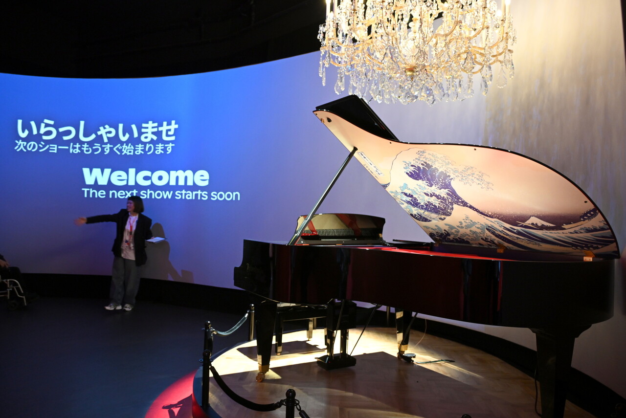 その価格、約5000万円。ピアノの屋根内側に描かれた葛飾北斎の浮世絵、「ウィンナートーン」と評されるベーゼンドルファーらしい音色、1000曲以上の自動演奏機能も備える。その他、AIを使った作曲体験、オーストリア料理が味わえるレストラン、ショップなどもある。