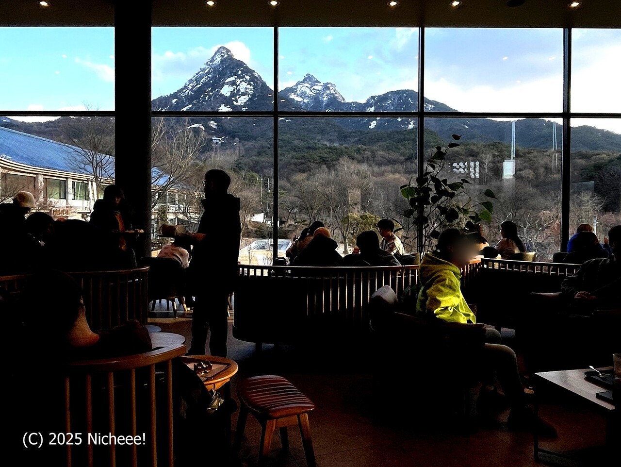 2階に上がると、ガラスの窓から北漢山がよく見える。まさに、絶景。座席数も多いが、平日午前以外はけっこう混んでいる印象だった。コンセントが下にある座席、またトイレもこの階にある。