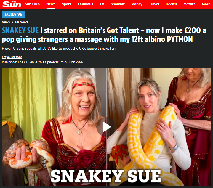 世界中に数多くのヘビマニアたちが存在するが、イギリスにも熱心な愛好家を発見したのでご紹介。ロンドンから車で約2時間、エセックス州ハリッジでヘビの保護施設を運営する「スネーキー・スー」(76歳)。もともとプロのベリーダンサーとして活動していたが、爬虫類があらゆるツボを刺激するのに最適と考え、1996年にヘビの啓蒙を目的とした「Live Snake Encounters」を立ち上げた。2025年1月の時点で約20匹のヘビを飼育しており、イギリスのザ・サン紙が英国最大のヘビ愛好家として取材。生きたヘビを体中に這わせるスネークマッサージで、まるで瞑想のように呼吸するだけで特別なリラックス効果を高め、人気の長さ3.5メートルのビルマニシキヘビ「ブーディカ」を選んだ場合は200ポンド(約4万円)。英国で長旅を検討している方は、イギリスのヘビお婆ちゃんもチェックしてみてはいかがでしょうか?