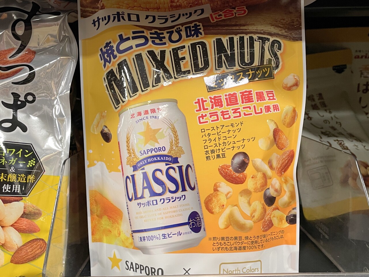 お酒のおつまみに、焼きとうきび味のミックスナッツもおすすめ。こちらの商品は、北海道産の黒豆やトウモロコシを使い、さらに「サッポロクラシックに合う」とアピール。サッポロクラシックのビールとともに味わうのはいかが?