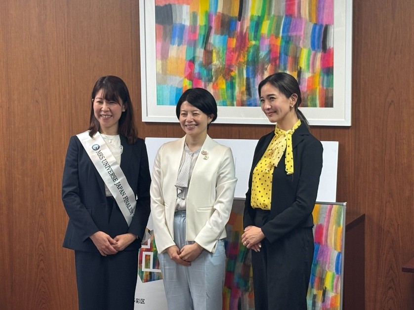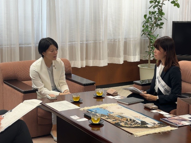 7月に「ミセスユニバース2025」の日本大会を控えた6月18日、ファイナリストの1人である中山未央さん(39歳)が、主催企業の代表である大島一恵さんとともに森澤恭子品川区長を表敬訪問し、女性活躍や社会貢献についての思いを伝えました。