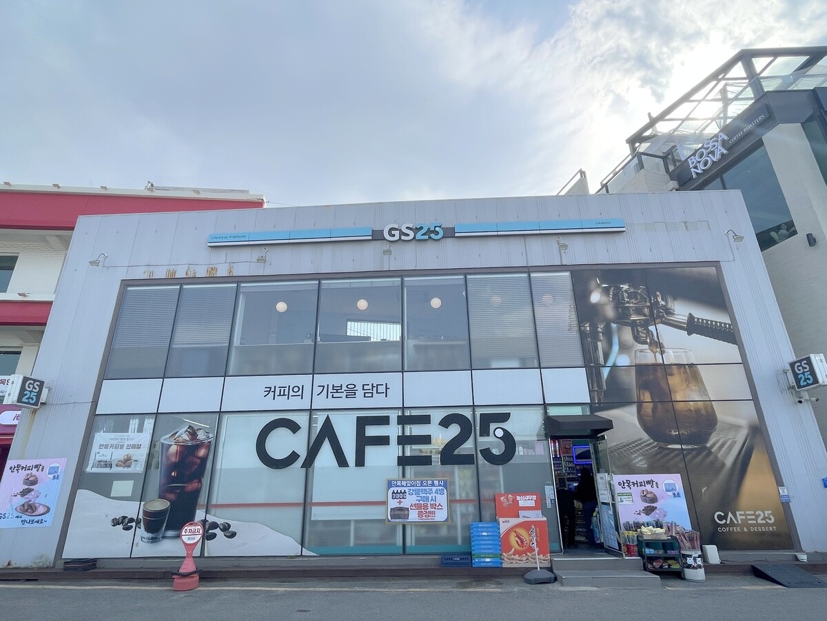 また、韓国で全国展開するコンビニエンスストアチェーン「GS25」の外観も、カフェ仕様なのもおもしろい。
