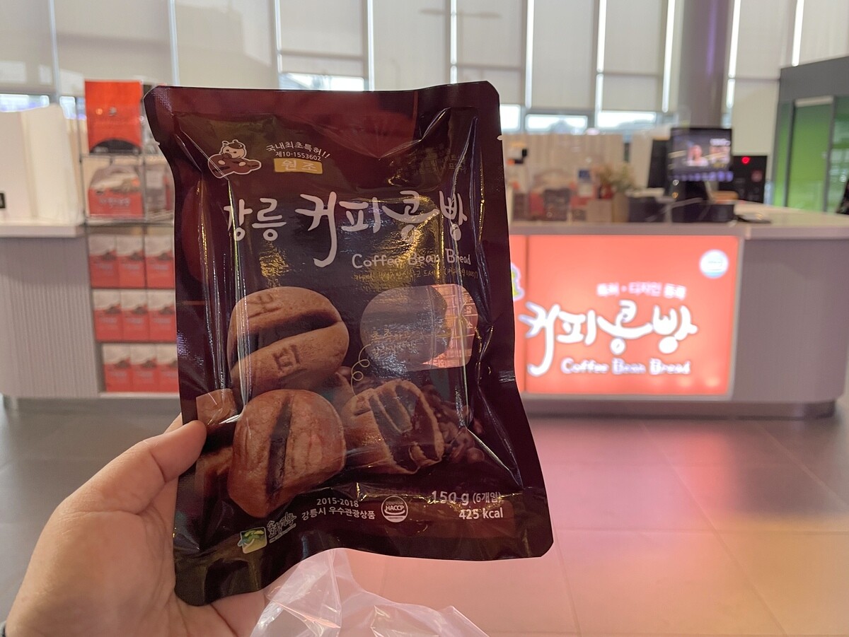 江陵みやげで人気なのが、これも「コーヒーまんじゅう」である。もちもちの生地にコーヒー味の餡がはさんである。KTX江陵駅に専門店があるほか、土産店などにも何種類か置いてある。
